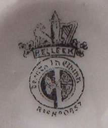 During 1926 a new Trade Mark was introduced. The Trade Mark took the form of a combination of the Second Period, complete with ribbon and a 'roundel' as shown below with Deanta in Eirinn. Please see our Newsletter Issue Number 31.3 for more detailed information. This version was used on parian pieces, Earthenware pieces were marked 'Melvinware'. Records are not able to confirm why this name change was introduced. There are a few versions of the Third Period Mark. Some are shown below. Markings from the Third Period are in Black. |
